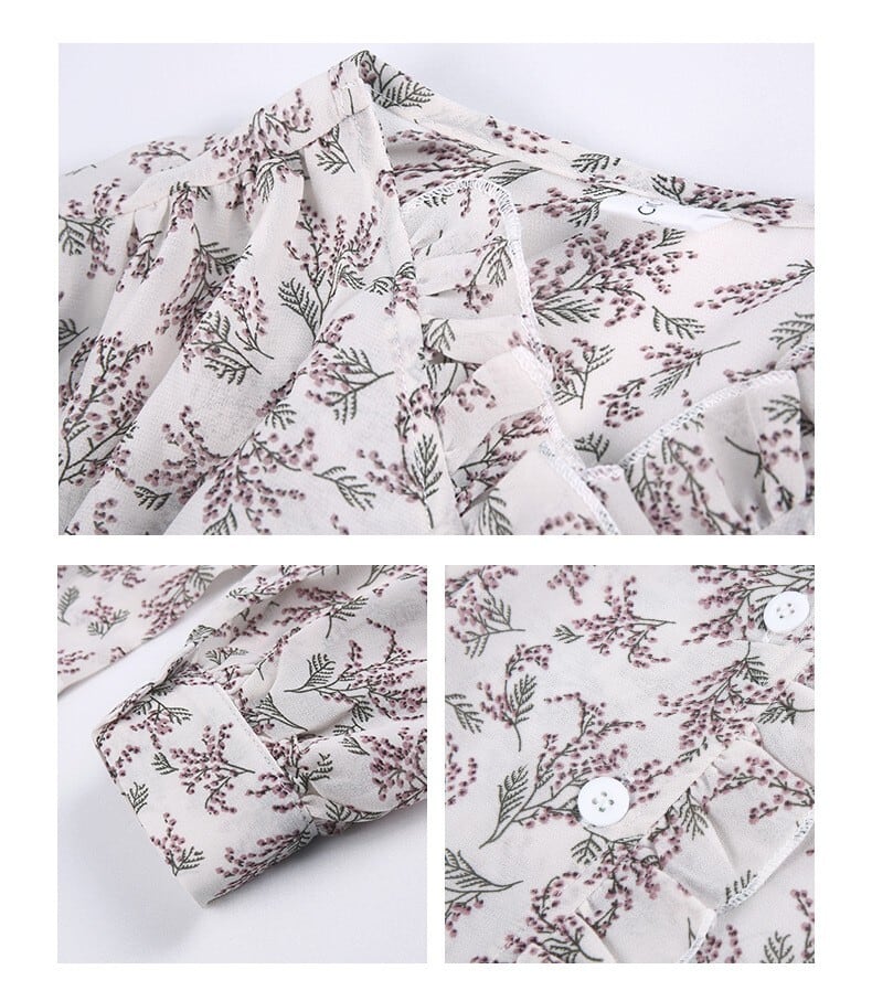 お首まわりのフリルが大人可愛い花柄ブラウス。