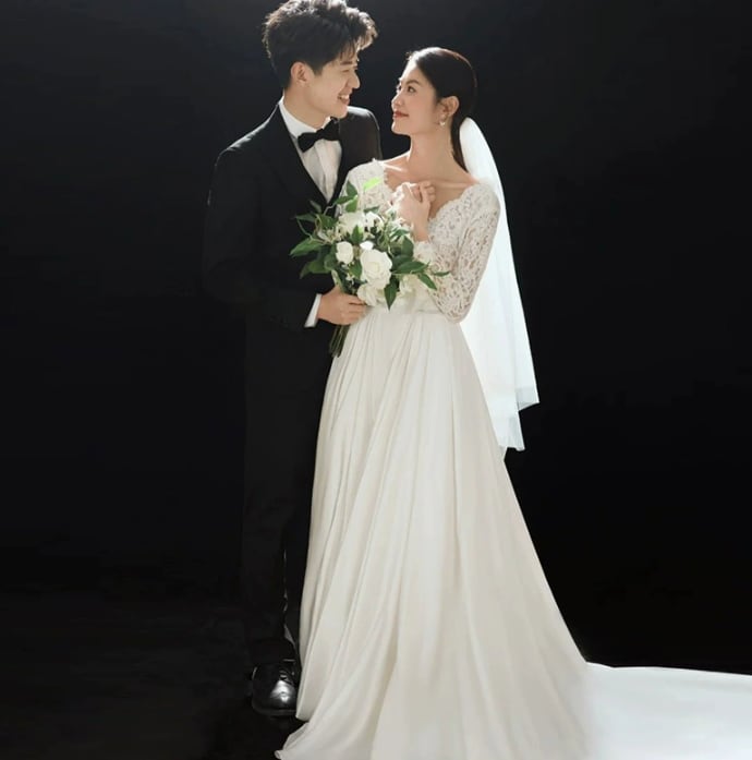ロングトレーンが優美でシンプルなウェディングドレス。