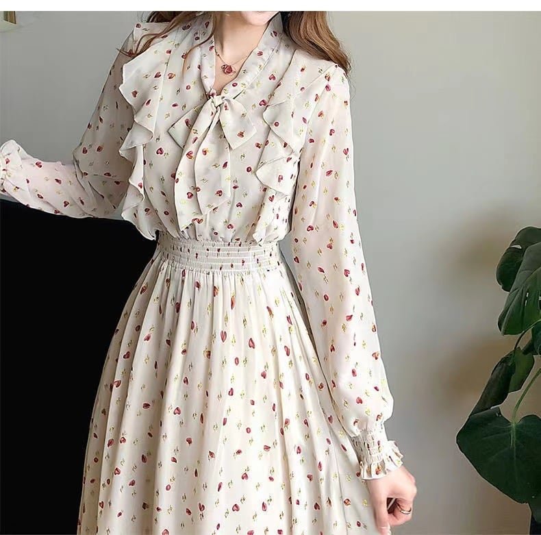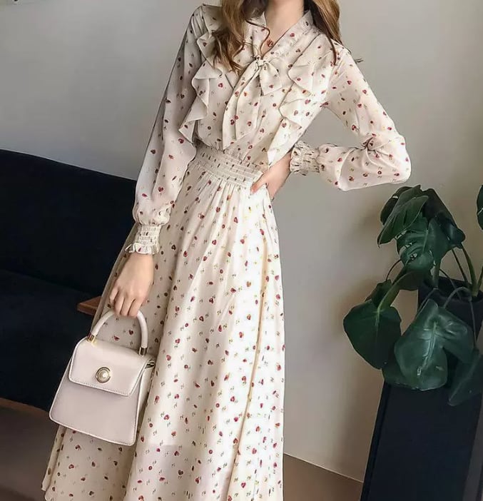 レトロで大人エレガントなロング丈の花柄ワンピース。