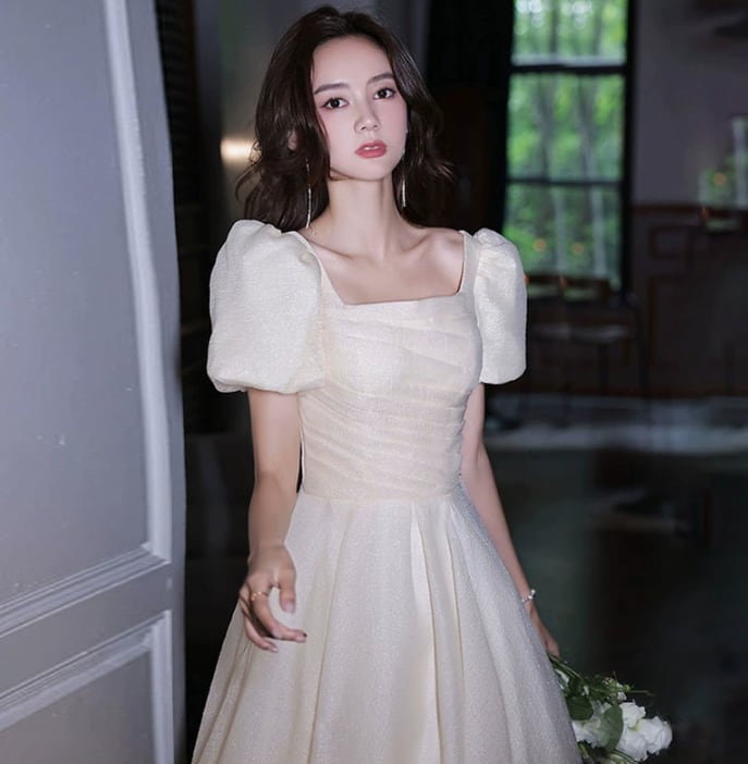 パフスリーブが可愛らしいaラインのウェディングドレス。