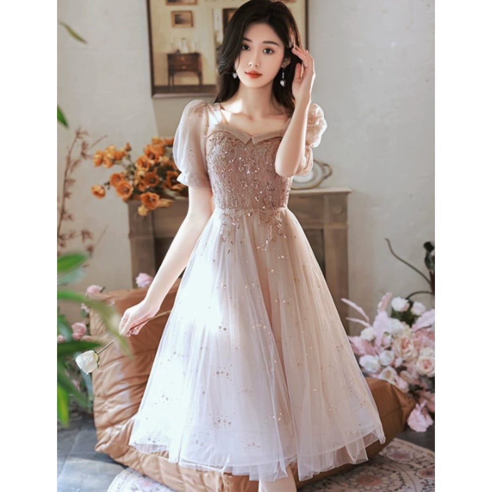 デコルテの大きく開いた大人可愛いパーティードレス。