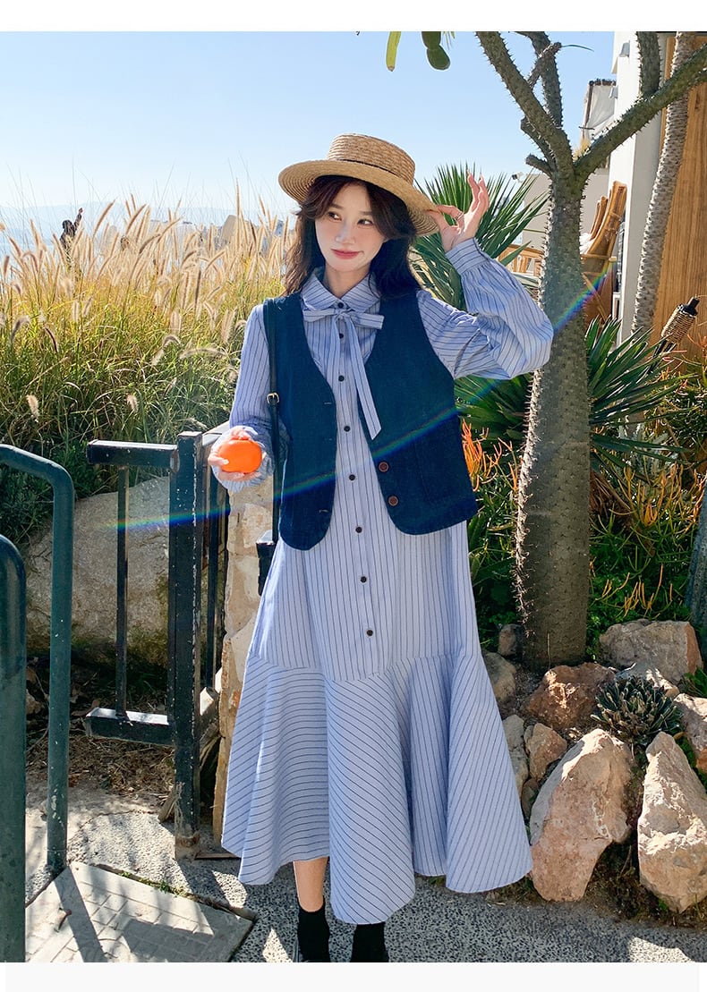 大人可愛いデニムベスト+マーメイドワンピースのセットアップ。