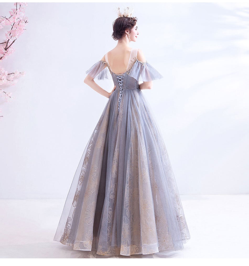 重ねられたチュールからほんのりお花模様が透けるカラードレス。