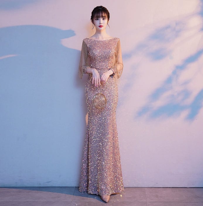 全身にほどこされたラメ感がきらびやかでドレッシーなよそおいに。