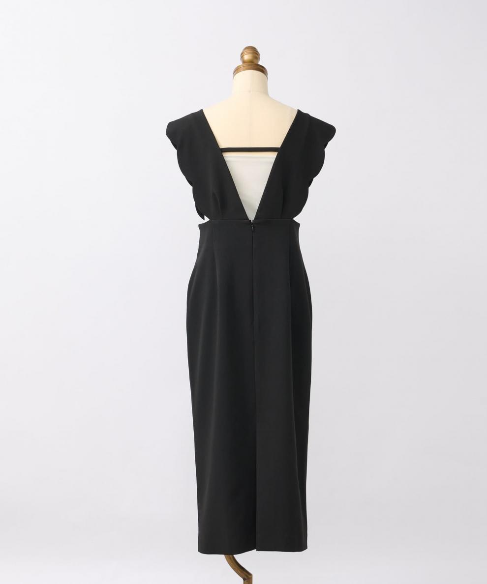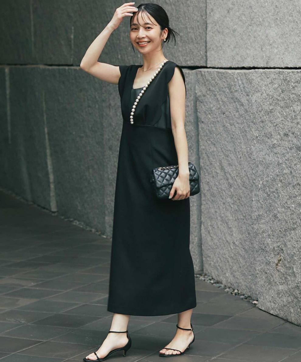 肩のフリルとパールモチーフがエレガントなワンピース。