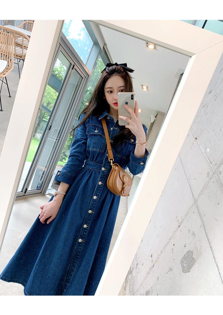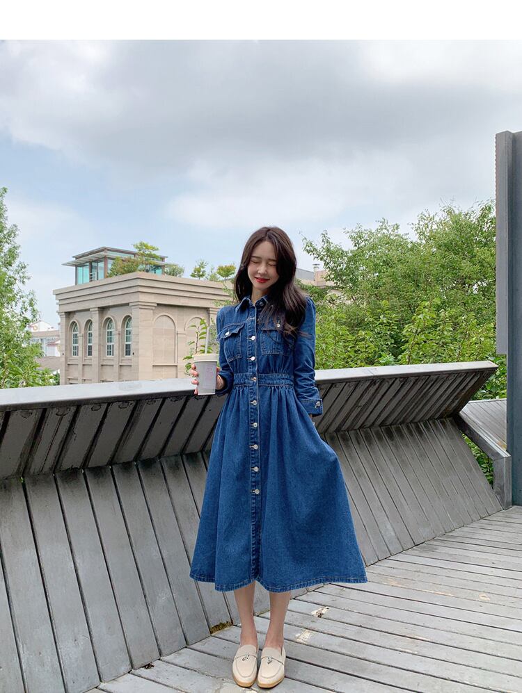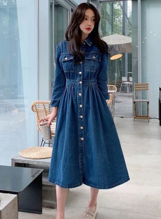 【ワンピース】 ワンピース レディース おしゃれ きれいめ 可愛い 春 秋 冬 デニム ミモレ ワンピース 20代 30代 40代 ワンピース 長袖 韓国 ワンピース ネイビー 青 S M L XL