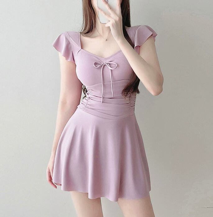 お袖のフリルで二の腕をカバーしスカートタイプで気になる太ももをカバー。