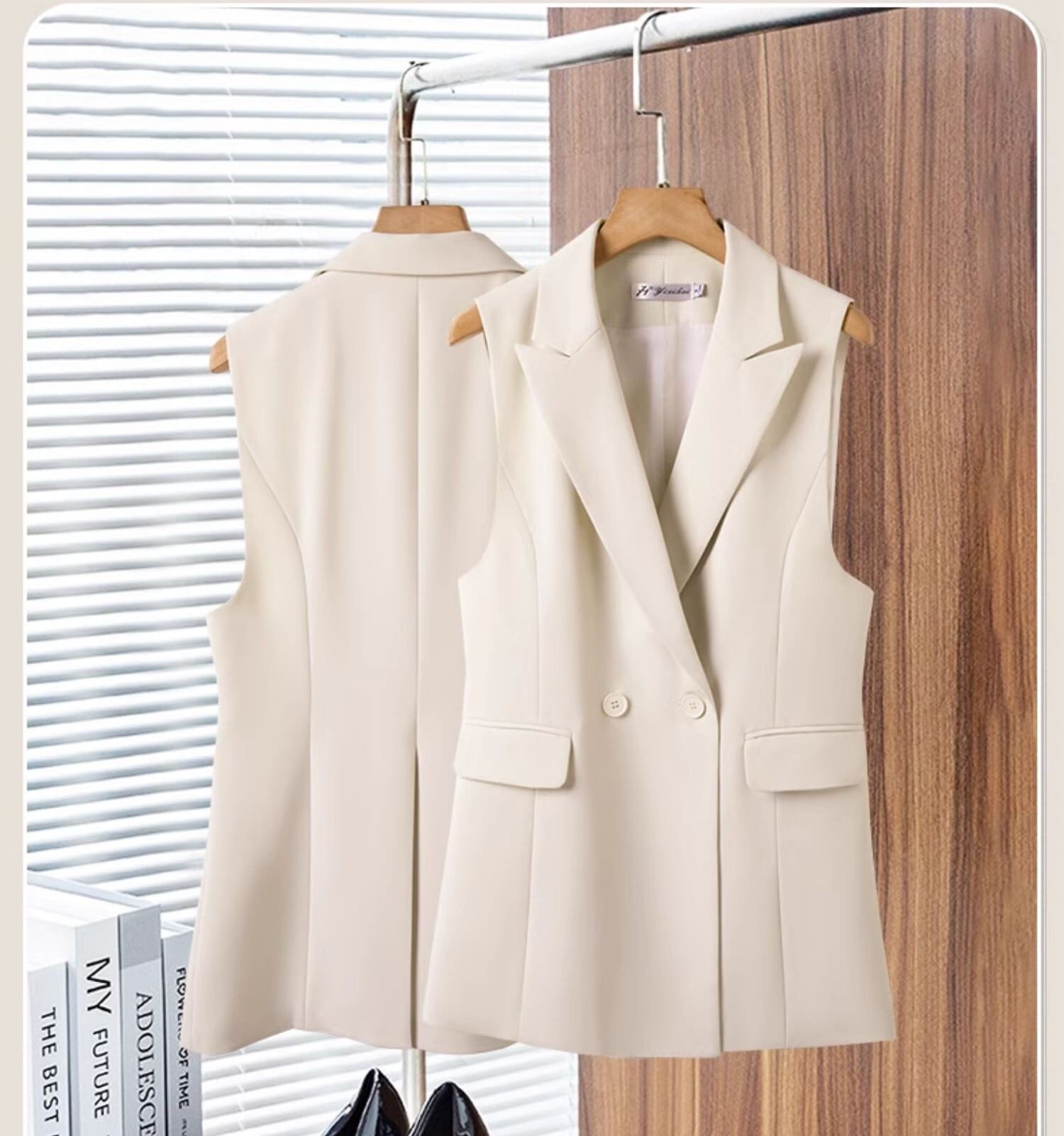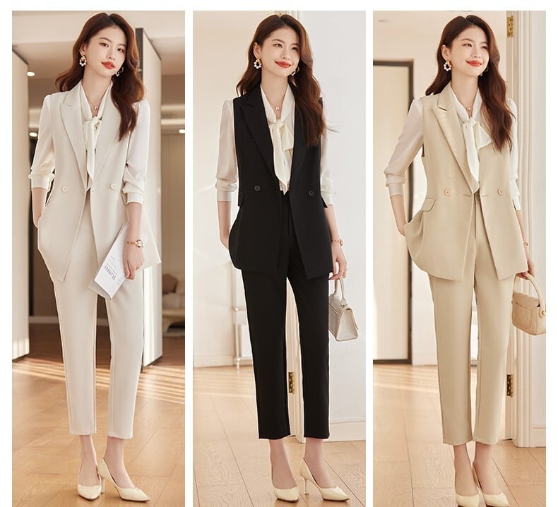 大人かっこいいベスト+ボウタイブラウス+パンツのセットアップ。